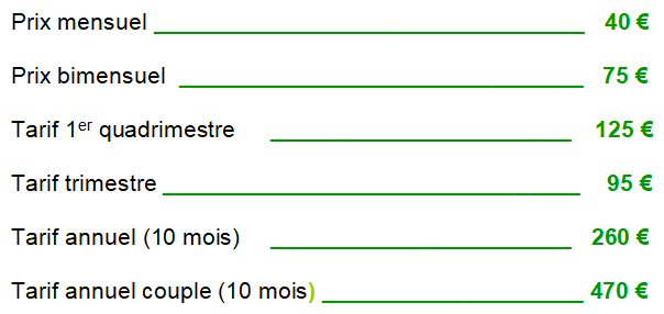 Le premier mois de cours est offert et un tarif préférentiel (10% de réduction) est appliqué pour les couples.