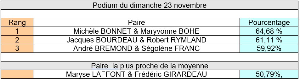 Classement à l'issue du tournoi du dimanche 23 novembre